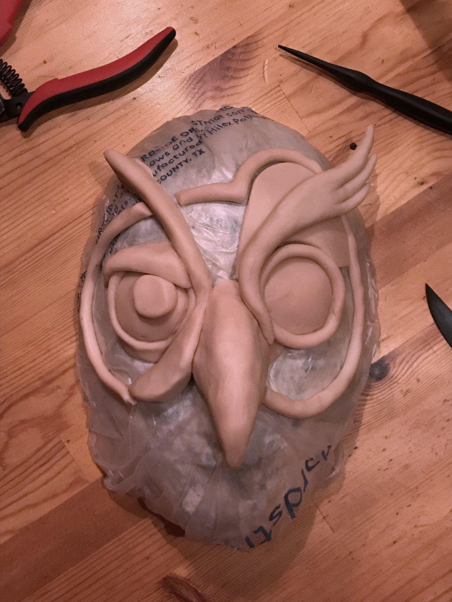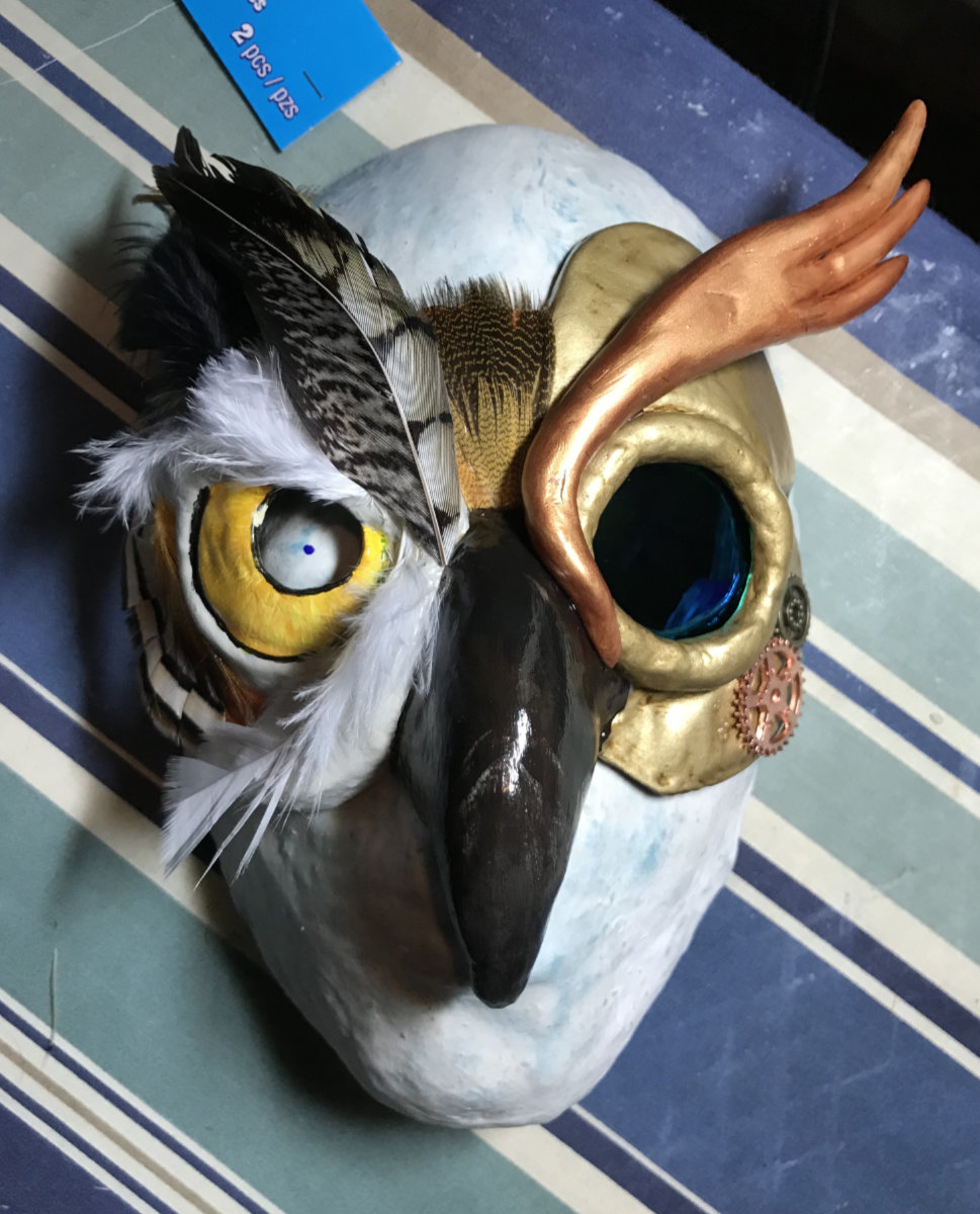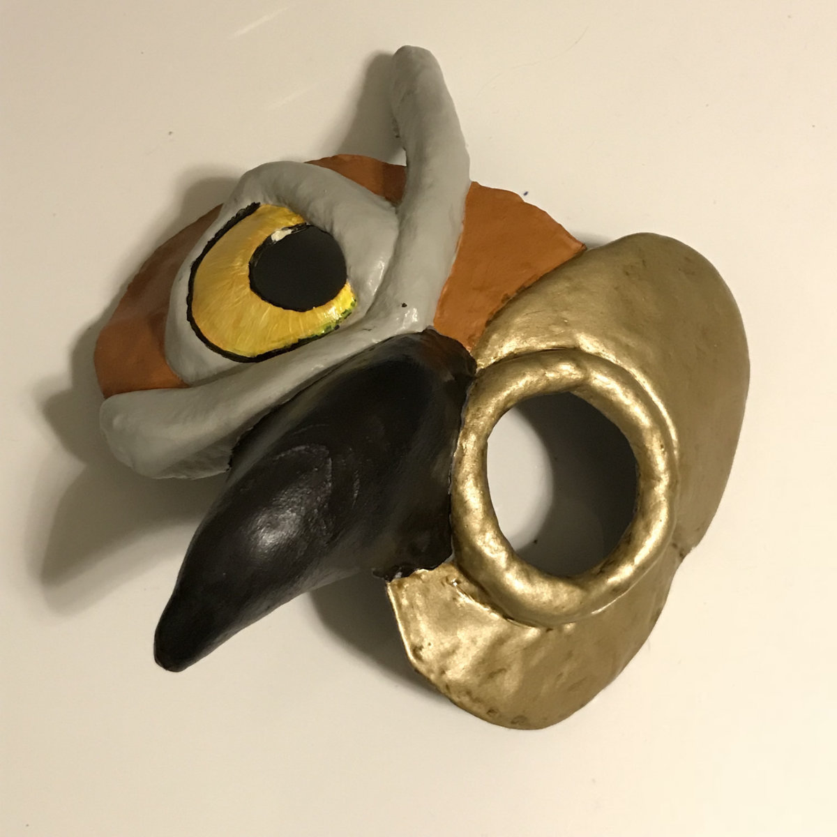For the natural side of the owl, the eye and the subtle texture of the beak were the most interesting. Most of the rest of that side of the mask was to be feathered, but those parts would be exposed. I wanted to make sure that the eye shined, so I used a glossy spray varnish after the paint went down.