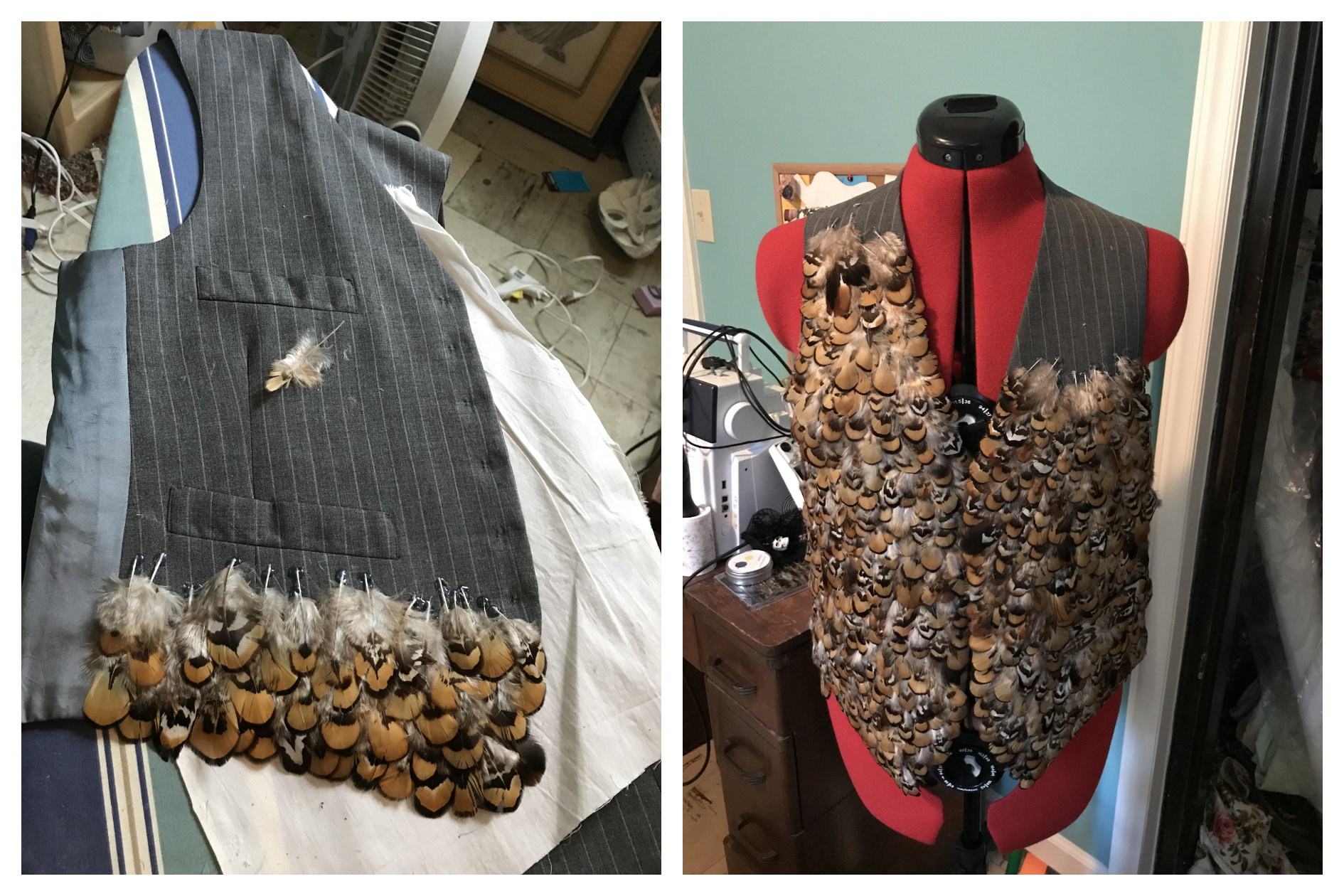 I’m not sure what to say about this part of the project. It wasn’t complicated, there aren’t many tricks, but it took a long time to glue the individual feathers to the wool vest.